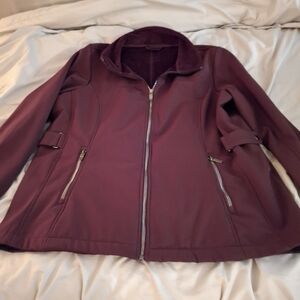 Chic dark burgundy utility jacket with zip closure by ZeroXposur. Ideal for layering and everyday wear. Size 1X. pit to pit measures 25 inches. Length 29 inches.