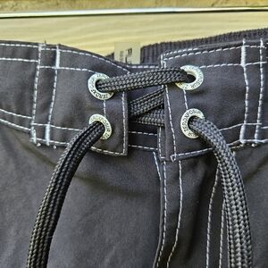 Black swim shorts with zip and snap closure, and a drawstring at the waist. Has elastic on the back of the waist. Built in black bikini bottom. One rear pocket with hook and loop fastener. In good used condition with no known flaws. See photos for fabric and care details.