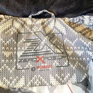 Excellent used condition. Only worn twice. Was a tad bit too small for me. Gray and White with a sweater pattern. Pocket on each side and a pocket on the arm. Several inner pockets, including phone and headphone pockets as well as a sunglasses pocket. Very nice coat. Rare pattern design. Quilted puffer. Super soft collar. Quality material. Removable hood. Zip closure. Ski jacket. No stains, holes, rips or tears. Super cute!