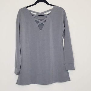 Gently used condition. See pictures for details. Slight discoloration on front. V-neck on back with cross /cage pattern on back.