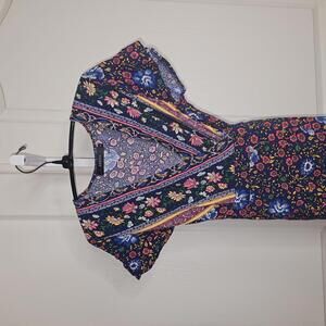 This maxi dress features a vibrant floral pattern on a dark background, perfect for casual or semi-formal occasions.