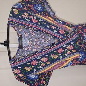 It has a flattering V-neckline and short sleeves for comfort and style.