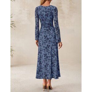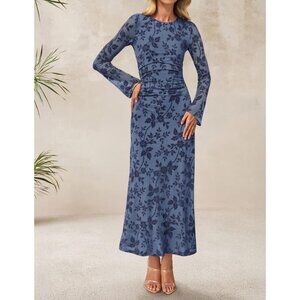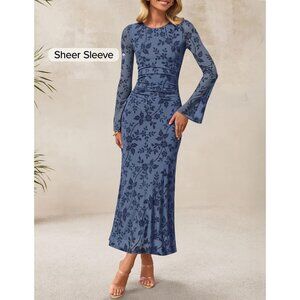 Zesica Women's Dusty Blue Ruched Mesh Long Sleeve Floral Bodycon Dress