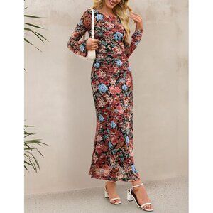 Zesica Women's Floral Black Ruched Mesh Long Sleeve Floral Bodycon Dress