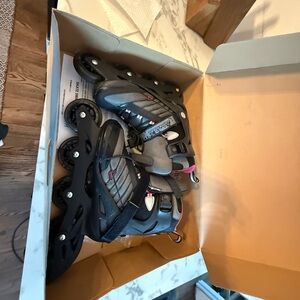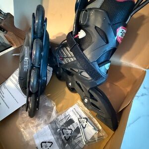 Stylish rollerblades with a sleek black design and pink accents. Perfect for outdoor skating.