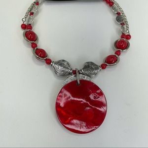 It features: Multi strand red & silver pendant necklace, shell, glass, metal, extension lobster claw