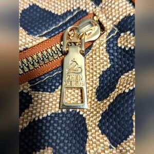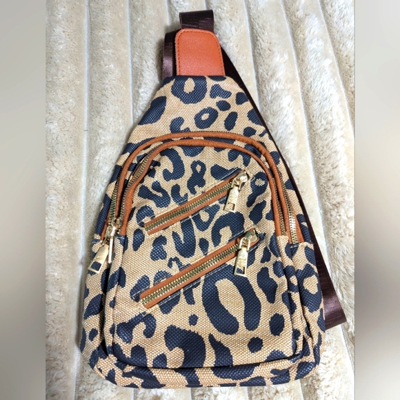 Zhen Meishi leopard print crossbody bag. Features multiple zippered pockets on the outside and 2 inner pockets.