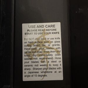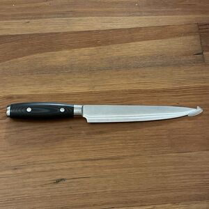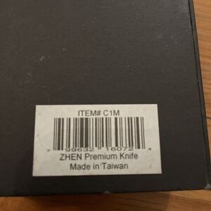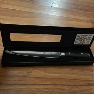 3 layer forged steel, premium, chef knife by Zhen. The knife is unused but the box does have some shelf wear to it. Black handle. Straight, 8 in blade which can be sharpened. Hand washable. In excellent unused condition.