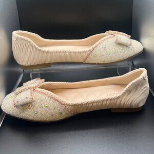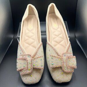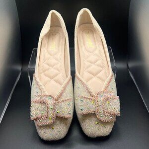 Zhiliunian Women Beaded Flats Square Toe Rhinestone Beige Shoes Size 8.5
