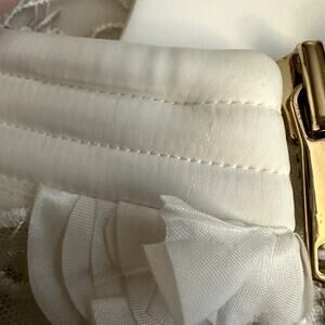 Zhivago The Vendetta Mini Dress in White. Size 4. Features semi sheer mesh long sleeves, partially lined, exposed gold back zipper hook and eye closure, padded shoulders, stitched satin paneling, rosette floral accents throughout, mini length, mock neckline cutouts at back. 100% polyester. Style 964. NWT / New with tags, faint untreated spots on neckline from being tried on, along with a few tiny snags.