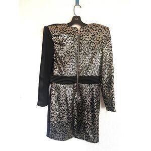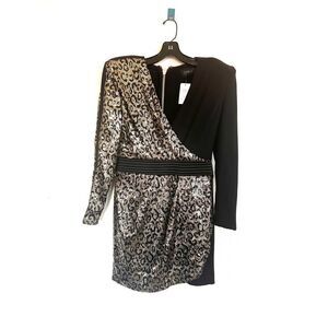 FULLY LINED 1/2 ANIMAL SEQUIN AND 1/2 JERSEY MINI DRESS, WITH A WRAP STYLE SKIRT, SIGNATURE STITCHED SATIN PANELLING & SHOULDER ACCENTS.