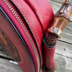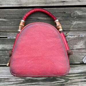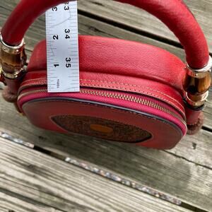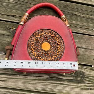 This has been used and could use a bit of some TLC, but its made with such quality materials that its made to last at least a lifetime. Its a beauty too- bamboo wooden handle and hard shell shape! Wonderful color of red with a catching mandala zen circle. Just looking for a new home- there is a knick on the back in the leather-see photos- there's also rubbing on the leather where the handles are at the top- please check photos closely as I tried to capture this at its worst. and Please please let me know if you have any questions