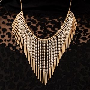 Seemingly separated by dainty gold beads, shimmery strands of white rhinestones majestically morph into gold rectangular frames along a sleekly rounded snake chain. The glamorously golden getup stacks into timelessly tapered tassels, creating a flauntable fringe below the collar. Features an adjustable clasp closure.