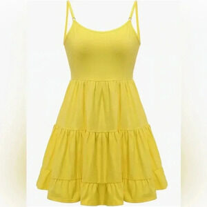 Women's Low-Neck Adjustable Summer Spaghetti Strap Sleeveless Dress. Fit and flare, swing skirt, a-line. This dress was worn once by me. Adjustable spaghetti straps. Perfect for summer, I put a denim jacket over, it was perfect with the vibrant yellow. Like new condition.