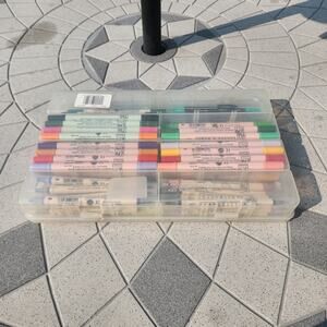Preowned: Ultimate ZIG double-ended markers with various tip styles and a Plano large rectangular clear plastic slotted storage case for organizing the different markers.