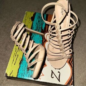 Zigi Soho Beige Strappy Sandals - GUC - size 8.5 - strappy all the way up - buckle closure - skinny heel - has some rhinestones C