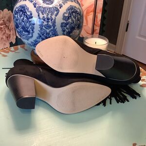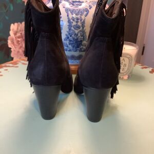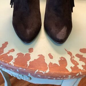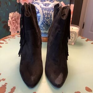 Super cute, fringed bootie, in deep black color. Uppers sueded fabric. There is wear of suede to the toe area of both boots and to the left heel. Heel height is 3.5”. Size 8.