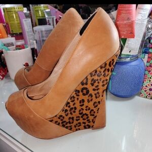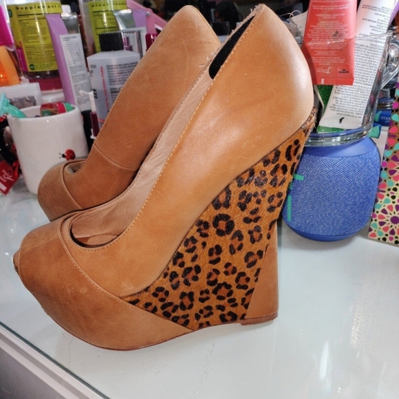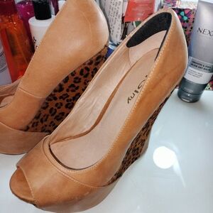 Pre loved platform leopard sz 8 , too big for me but I love them. I put a comfort cushion to hug the heel and fit me better. They are able to be removed they have lots of life yet and super comfortable. Small stain inside left inner. Please look at all pictures.