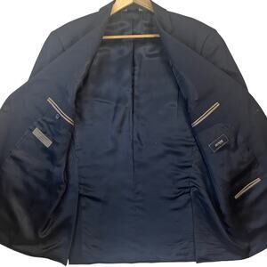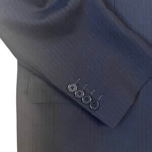 Zignone Super 120’s Pronto Uomo Signature Made in Italy 100% Wool Blazer Sport Coat. Black on black with barely there pin stripes, notch collar, 2 button front with double vent and 4 button cuffs. Lined.