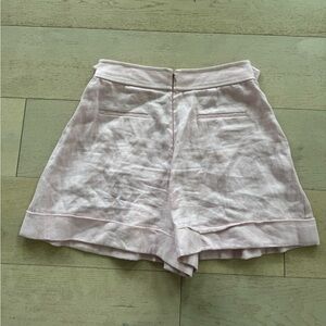 High-waisted High Tide shorts in pink linen. It features side button detailing, pleated design, rear zip closure, two side welt pockets and two rear welt pockets.