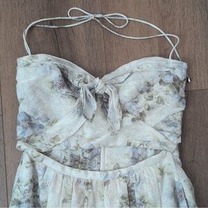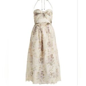 Zimmermann cutout tie neck midi dress. This dress is gorgeous, with embroidery throughout the skirt and a scalloped hem. Hidden zip in back. Worn twice, in excellent condition with no flaws. Size 1 = US 6 / M, fits somewhat small, please check size chart