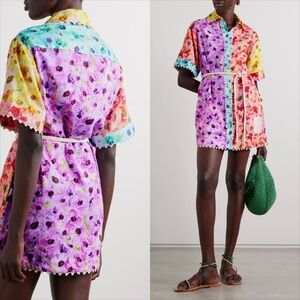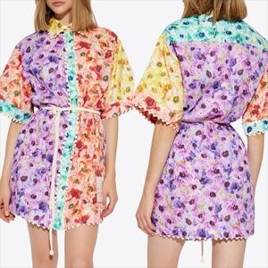 Zimmerman lightburst button down belted crochet trimmed floral mini dress