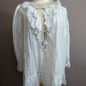 Gorgeous Zimmerman Size 2 -- equal to a medium. Features deep-V, ruffle collar, sleeves, and hem all with a raw edges. The length is versatile and can be a tunic top, a dress, or even a beach coverup. The fabric is lightweight, breezy, intentionally crinkled, and is slightly see through (I'm wear black bralet under to show.) Casual, timeless and romantic perfect for everyday wear. White background with black pinstripes.