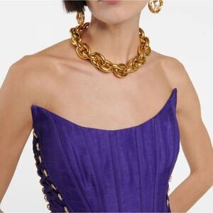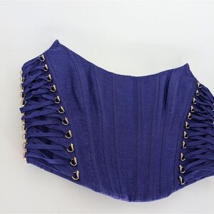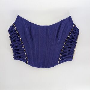 Elevate your wardrobe with this stunning Zimmermann corset-style top in a rich navy blue. Featuring gold hardware and intricate side lacing details, this piece exudes elegance and sophistication. Perfect for a night out, date night, or a chic daytime look.