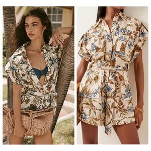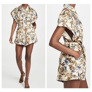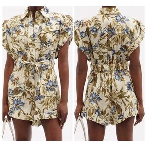 Zimmermann Aliane Belted Roll Cuff Linen Playsuit in Khaki Floral size 0 | US 4