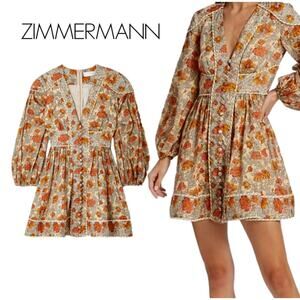 Zimmermann Andie Buttoned Floral Linen Mini Dress Long Sleeve 3 Large