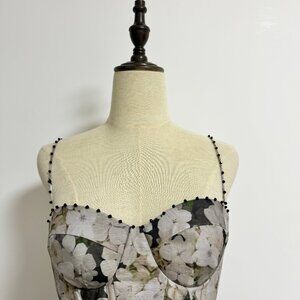 A silk linen midi dress featuring a fitted bustier with a bead trim, shirred back bust and adjustable shoulder straps.