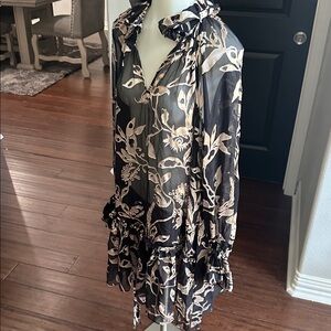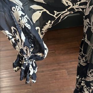 Chic dress with floral design. Features black and cream hues. Ideal for a fashionable statement. Super darling looks like money well spent with beautiful ruffled collar and wrist