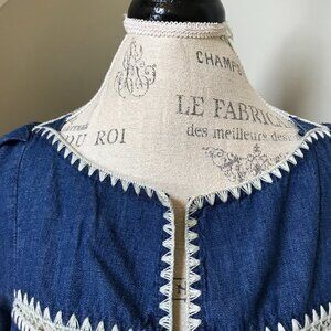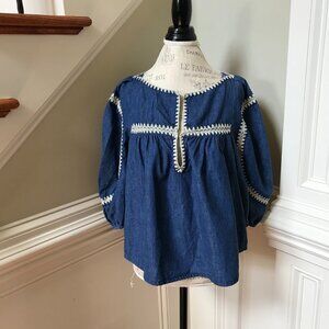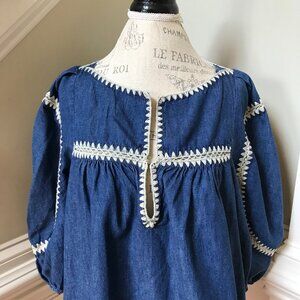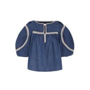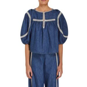 Women's Zimmermann Chintz Denim Smock Top / Shirt in a size 3 - US Large. Constructed in Bay Blue, A denim blouse featuring short blouson sleeves and embroidered trims throughout. Originally $425. Fast Same Day Shipping!