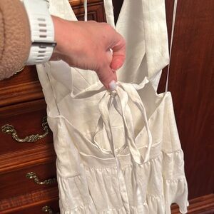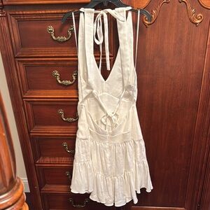 This stunning Zimmermann linen dress in cream features a ruched bodice and a ruffled hem, perfect for a cocktail night out. The sleeveless design with a halter neckline and a plunging front adds a touch of elegance, while the backless style ensures a captivating look.