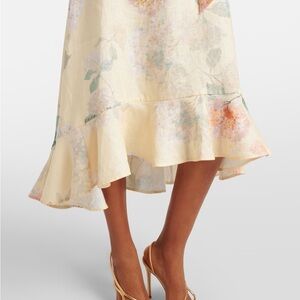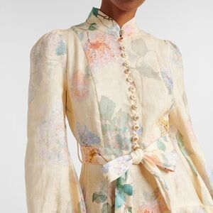 Stunning lightweight linen, Zimmerman's peplum midi-shirtdress features a 19th-century-inspired silhouette blooming with a whimsical floral print. Voluminous long sleeves, a tonal belted waist, and ruffle detailing add to this charming look.