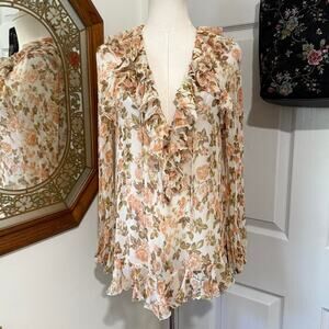 Zimmermann cream 100% silk & peach floral pattern crinkle ruffled long sleeve sheer top with tie front - Size 0/X-Small/Small, see measurements below!