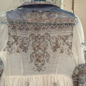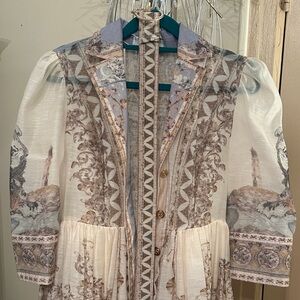 Elegant Zimmermann midi dress. Features intricate patterns. Soft cream and pink tones. Perfect for any occasion.
