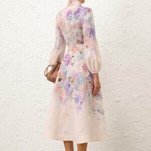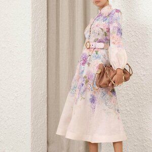 This button-down midi dress features a colorful hydrangea pattern. This linen midi dress features long, loose sleeves with elastic cuffs, a center front button closure, and a removable covered waistband.
