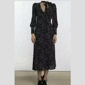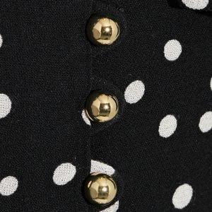 Midi length empire line dress featuring gold buttons down the center and on the cuffs. Style with booties for dinner or a heel and gold jewelry for an event.