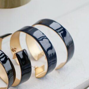 Small Enamel Hoop Earring, from our Fall 17 collection, in Dark Navy. Gold plated brass small hoop earrrings with Dark Navy enamel paint. 14 mm diameter, 53 mm high. Brushed gold plated brass. Enamel color.