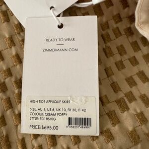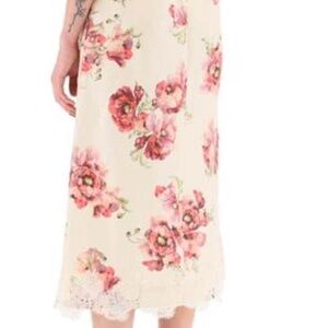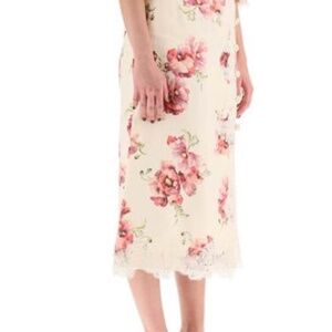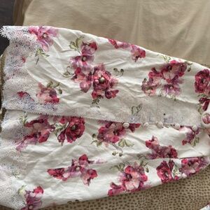 Elegant cream skirt with pink floral pattern. Delicate lace detailing. Perfect for a chic look.