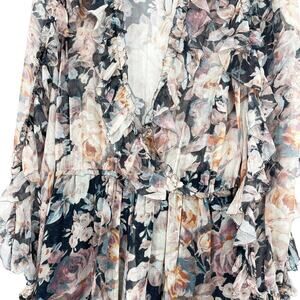 tags: Zimmermann romper, floral playsuit, size 1 Zimmermann, long sleeve romper, tiered ruffle hem, sheer floral fabric, designer resortwear, feminine one-piece, vacation outfit, pre‑owned luxury romper, garden party romper, airy spring outfit