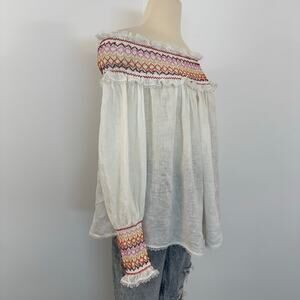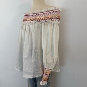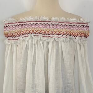 Zimmermann Goldie Rainbow Off The Shoulder Smocked White Linen Blouse Top Size 1