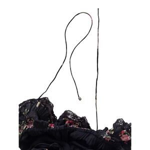 Black floral print, spaghetti straps tie at shoulder, thin belt ties at waist, relaxed fit and belt cinches waist, pullover style, midi length, lined.
