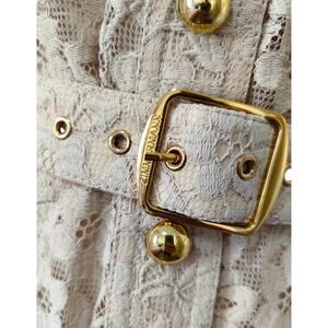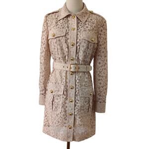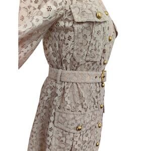 The Hypnotic Lace Utility Dress in Cream. A utility style mini dress featuring patch pockets, a belted waist, and gold buttons along the centre front, cuffs, and shoulder tabs.