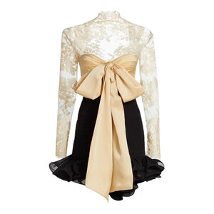 This ZIMMERMANN mini dress features floral lace appliqué, rear hook and eye fastening, a concealed rear zip fastening, bow detailing at the bust, long lace sleeves, cut-out and open-back detailing, pleat detailing at the skirt, full lining, and a peplum hem. It is thigh-length and made of a silk and cotton blend.