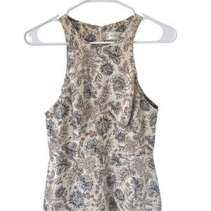 This dress is a Zimmermann Ivory Blue Floral Linen Midi Dress. It features a high neckline with a sleeveless, fitted bodice and a midi-length hem. The fabric is a lightweight linen with an elegant ivory background and intricate blue and taupe floral patterns. The design is classic and vintage-inspired, with a delicate, ornate floral motif that gives it a timeless, feminine look. The back has a simple yet structured cut, making it both elegant and breathable—perfect for warm-weather occasions.