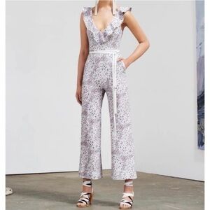 100% Linen! Gorgeous jumpsuit by Zimmerman. Ruffle neckline detail. Measurements are included in photos. size 1. See size chart. Equivalent to size 6 US. Good used condition not noted holes, rips, or tears. There is some marking on the bottom of the legs. It looks as though the previous owner may have spilled coffee. I have not tried to spot treat or dry clean it out. Price reflects! It’s really not noticeable when worn unless you know it’s there and to look for it :)