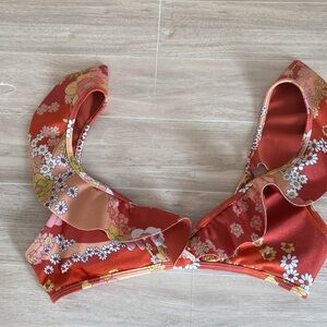 This Lola Waterfall bikini from Zimmerman is covered with a vibrant floral print, showcasing the label's penchant for cheerful patterns. That cheerful attitude is enhanced by the frilled neckline. Imported Highlights pin/ rustic orange frilled neckline all-over floral print