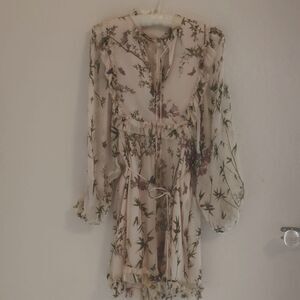Maples Frill Playsuit in Cream Floral silk crinkle georgette. Gathered playsuit with frills throughout neckline, bodice, elasticated sleeve cuffs and short hem. Picot edge finish on all frills, draw shoestring necktie and waist tie with tassel ends. Centre back invisible zip closure, lined bodice and short, sheer blouson sleeves